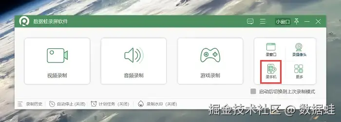 步骤1:在电脑桌面上打开数据 蛙录屏软件,这里有多种录制模式(游戏、视频、音频等)可供选择,我们点击“录手机”模式。