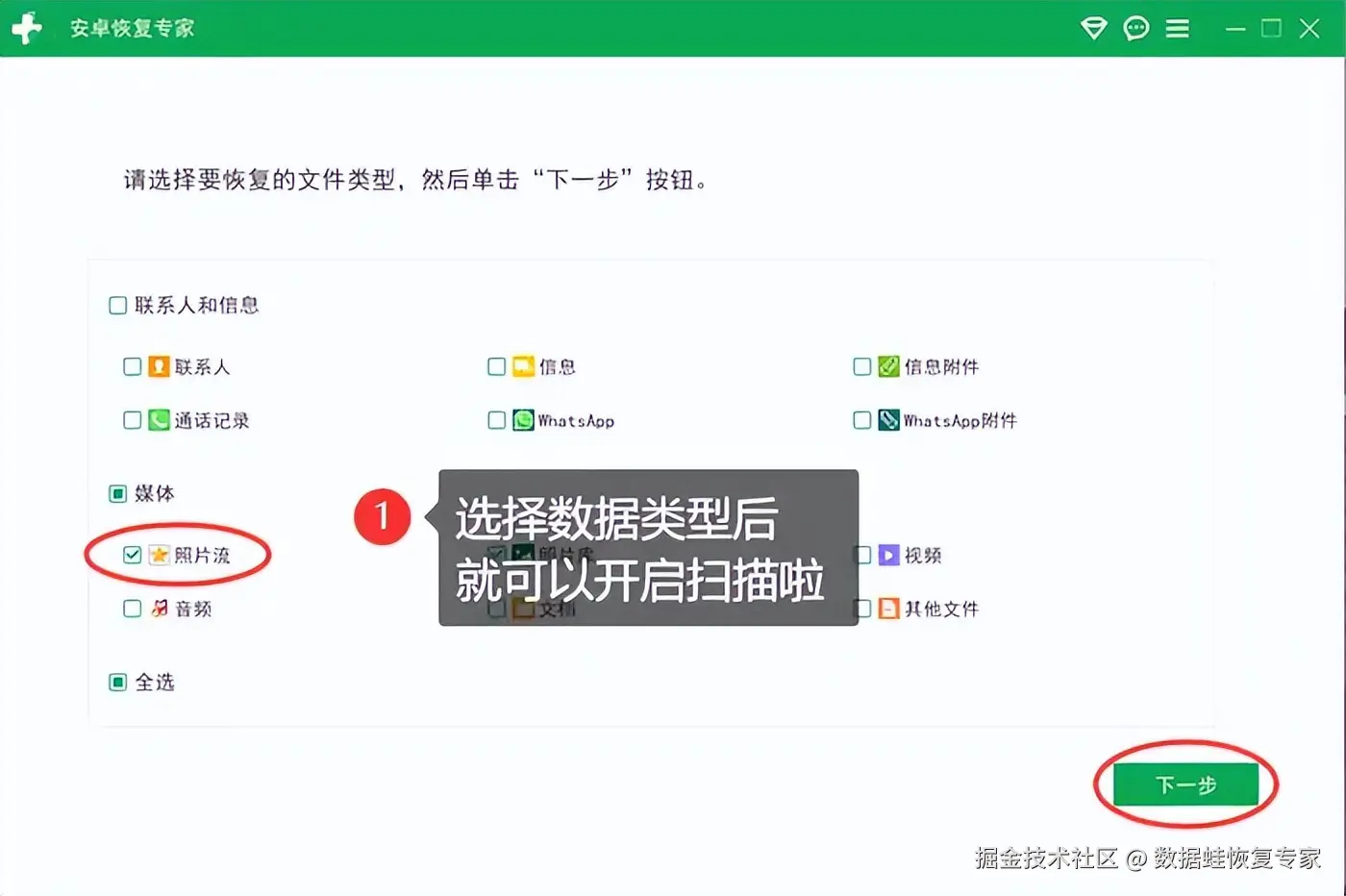 步骤2:选择恢复对象并扫描:选择合适的恢复类型,软件将开始深度扫描手机内存,找到被删除的照片。