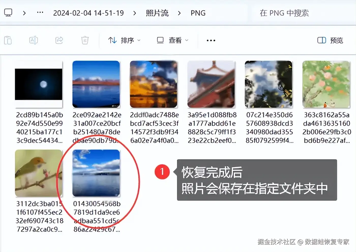 步骤4:查看已恢复的照片:恢复进度条满了之后,保存数据的文件夹会自动弹出。届时就可以查看这些照片,将它们传输到手机中啦!