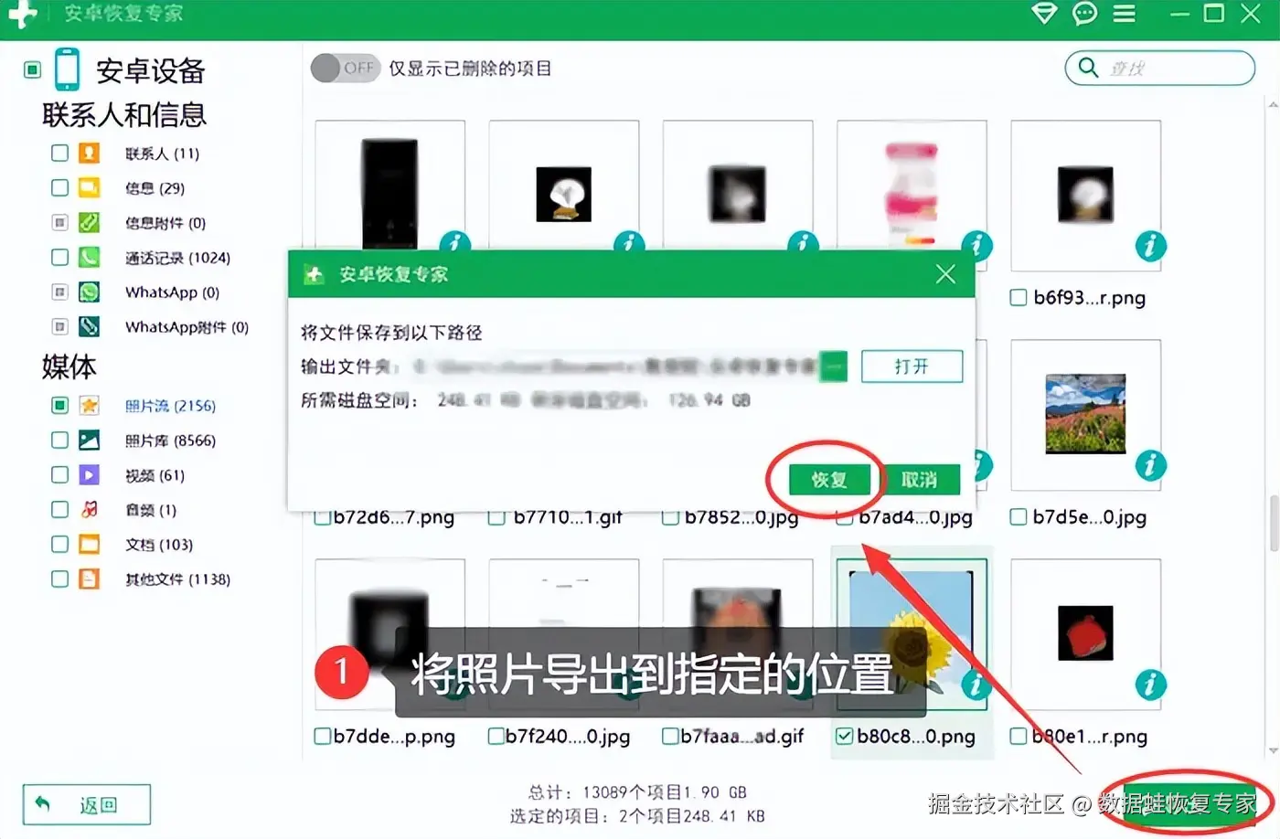步骤3:恢复照片:选择需要恢复的照片,点击 【导出】 按钮,它们将被保存到你的手机或电脑上。