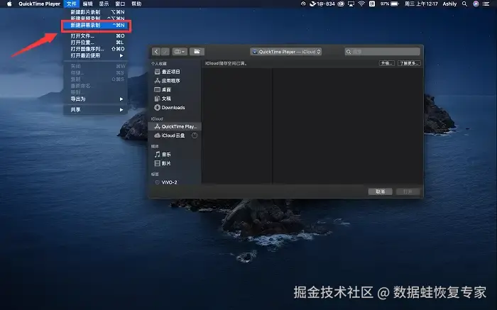 步骤2:打开QuickTime Player后,点击菜单栏的 【文件】 ,选择 【新建屏幕录制】 ,捕捉录制区域后进入录制。