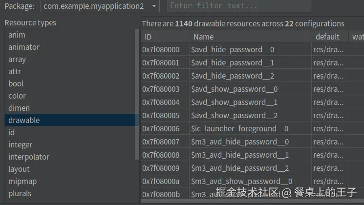 该类主要是一堆的常量。但是新版的Android Studio它已经隐藏起来了。通过打开apk,可以看到带有arsc后缀的文件。打开它,可以看到所有的资源ID。