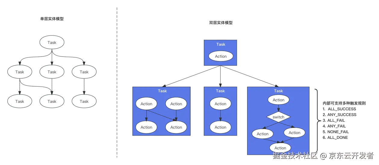 •Task(任务): 任务是由一个或多个环节+触发规则构成的DAG,Task和Task之间也可以相互依赖,在外层构成一个DAG,实现双层调度。