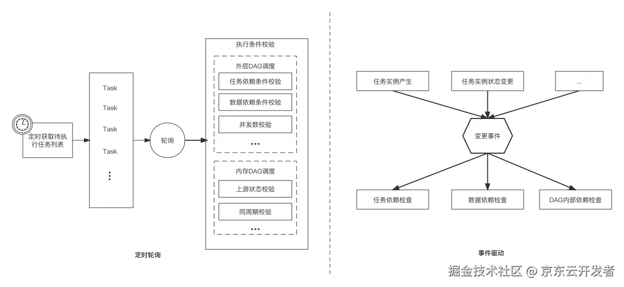 相比定时轮询,事件驱动不会采用定时拉取、全量校验的方式,而是在任务所依赖条件的状态发生变更时,才会基于事件做出相应的条件计算和校验动作,这样可以有效避免定时轮询面临的两个核心问题。同时针对不同的事件类型,可以分别进行异步并行处理,有效提升整体的处理性能。
