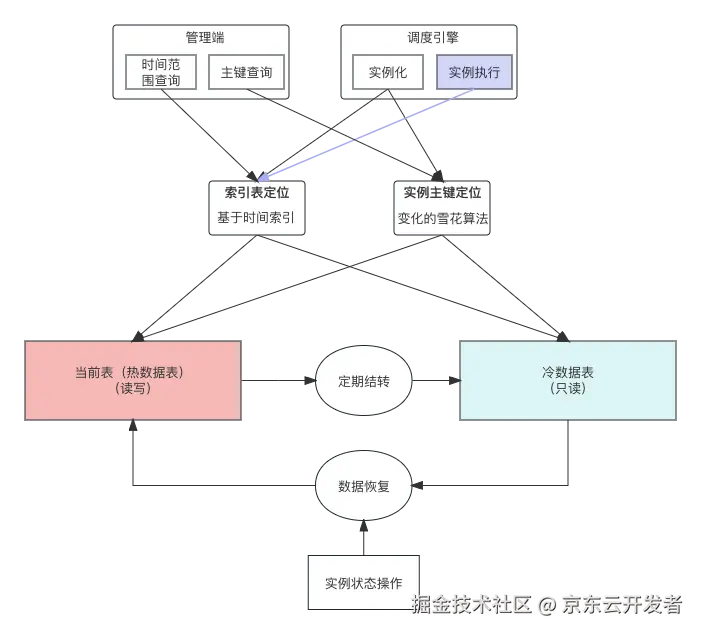 冷数据被操作的几率比较低,但也存在操作的可能性,比如历史实例的重跑、强制成功等操作。为了保持调度引擎架构的简单性,所有相关的任务执行的处理,都是基于当前表(热表),所以为了能保障被结转的冷数据和热数据一样支持所有操作,冷数据被操作时会从冷数据表恢复至热数据表,从而实现与热数据相同的效果。