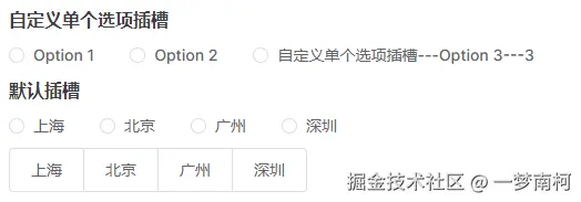 给选项添加 slot 属性,可以自定义单个插槽。也可以通过默认插槽,实现自定义 radio