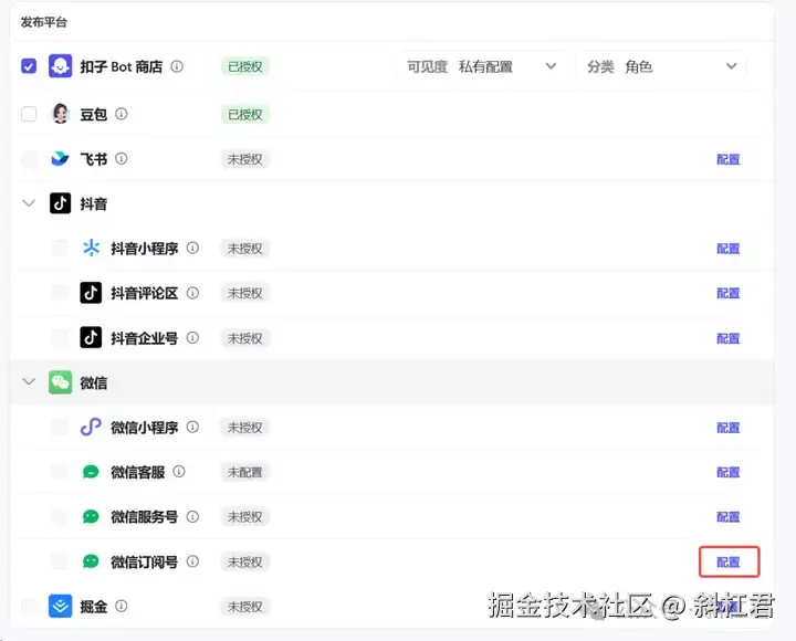 找到「微信订阅号」,点击「配置按钮」