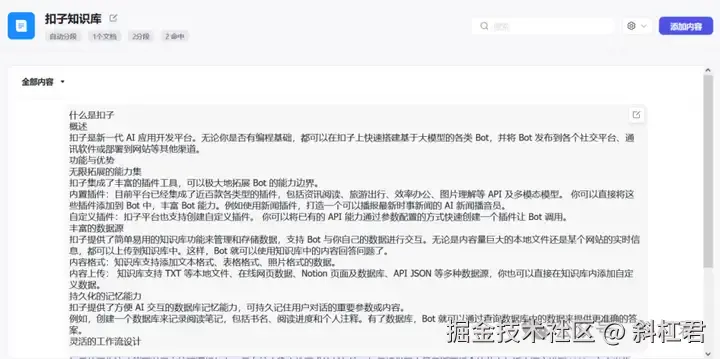 把「扣子知识库」添加到Bot中。