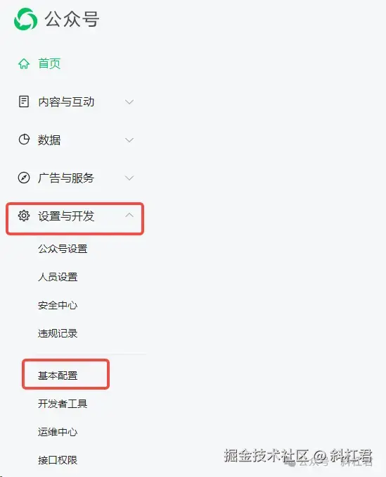 进入到你的公众号管理后台,依次找到 「设置与开发」->「基本配置」