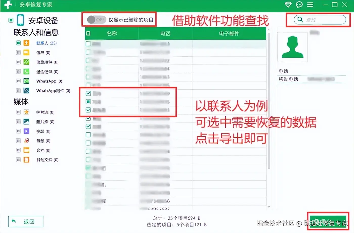 第三步:选择需要恢复的数据,然后点击 【导出】 。在弹出的窗口中,确认保存路径,就可以开启恢复啦!