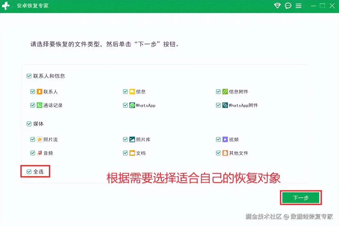 第二步:连接完成后,根据指引,选择需要扫描的数据,然后点击 【下一步】 ,就能够开始扫描。软件将对手机数据深度挖掘,请保持设备连接稳定。