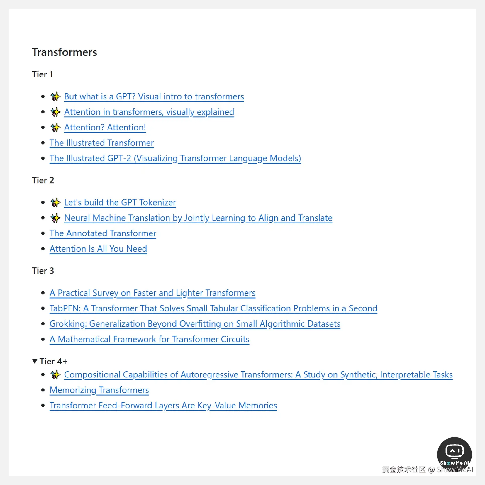 以 Transformers 板块为例。可以看到,清单中每部分内容都包含4个 tier。按照从1到4的顺序阅读,即可基本覆盖这部分的内容要点~