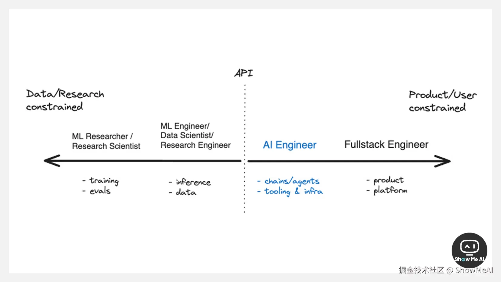 Swyx 绘制了一张岗位光谱图,👈 左侧受到数据/研究约束 (Data/Research constrainted),👉 右侧受到产品/用户约束 (Product/User constrainted);最左侧岗位与机器学习 (ML) 密切相关,最右侧岗位已经不涉及 ML 技能。划分边界就是 API (大模型调用接口)。