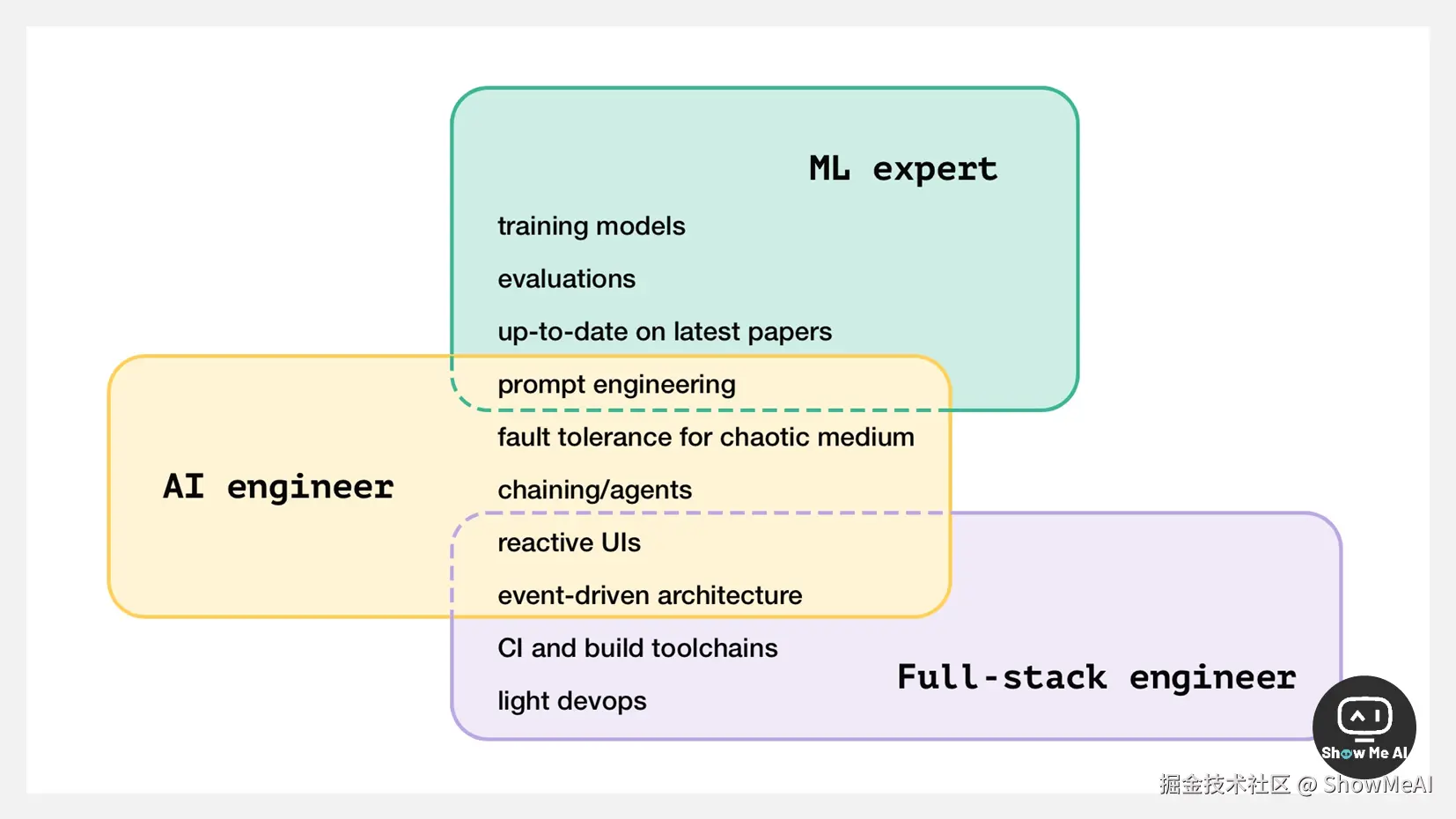 换个角度理解,AI Engineer 承包了 ML Engineer 工作中与模型无关的部分,使得 ML Engineer 有余力和能力去研究模型。或者说,市场并没有足够多的 ML Engineer 储备,因此需要一个新的角色来填平各方的需求。