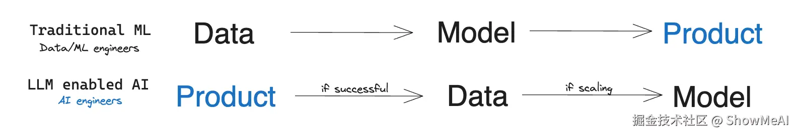基于AI的 LLM 工作流是 fire - ready - aim, AI Engineer 先使用提示词快速构建和验证产品创意,再获取特定数据进行微调。不仅速度快,而且成本低 (只有传统工作流的千分之一到万分之一)。