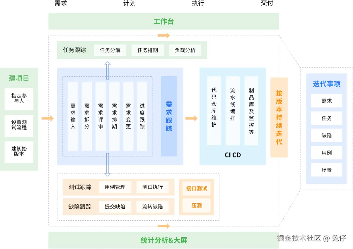 包含了从需求、到任务、到用例、到测试、到缺陷、到自动化测试到上线,并自动生成迭代总结并存档