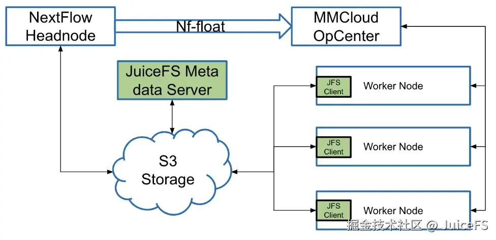 JuiceFS 在性能与成本效益方面的显著优势,因此成为我们的最终选择。在我们的架构中,当 NextFlow 触发任务时,我们利用 OpCenter 机制动态创建一个 JuiceFS 实例。用户需提供对象存储的位置,随后该对象存储将被 OpCenter、NextFlow Headnode 及所有相关方共享,从而全面满足我们的需求。