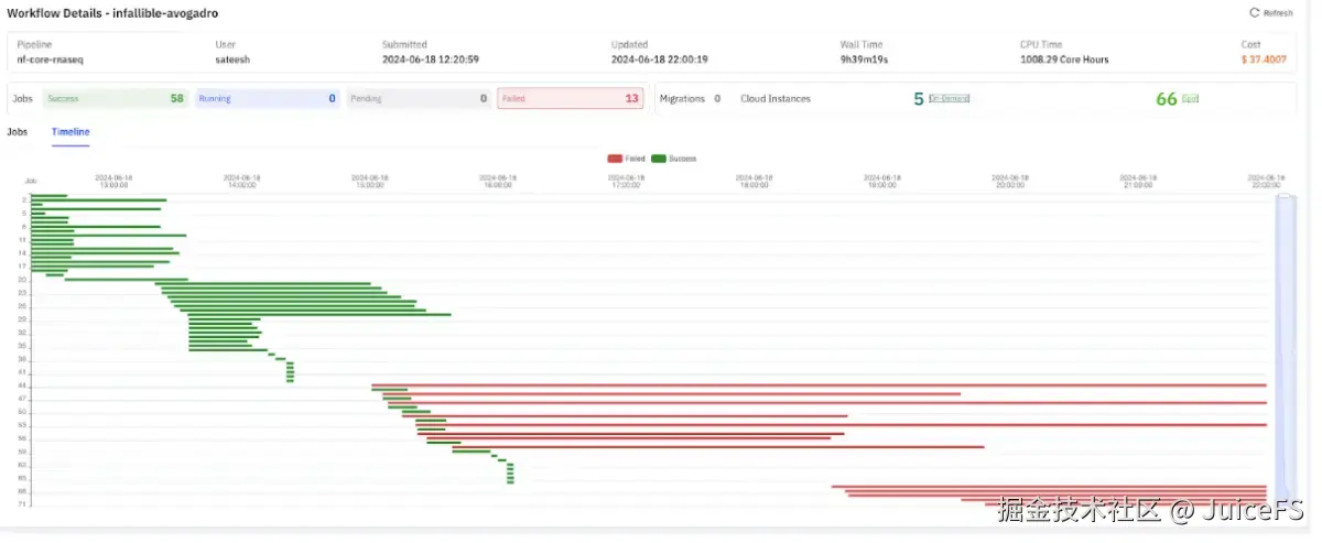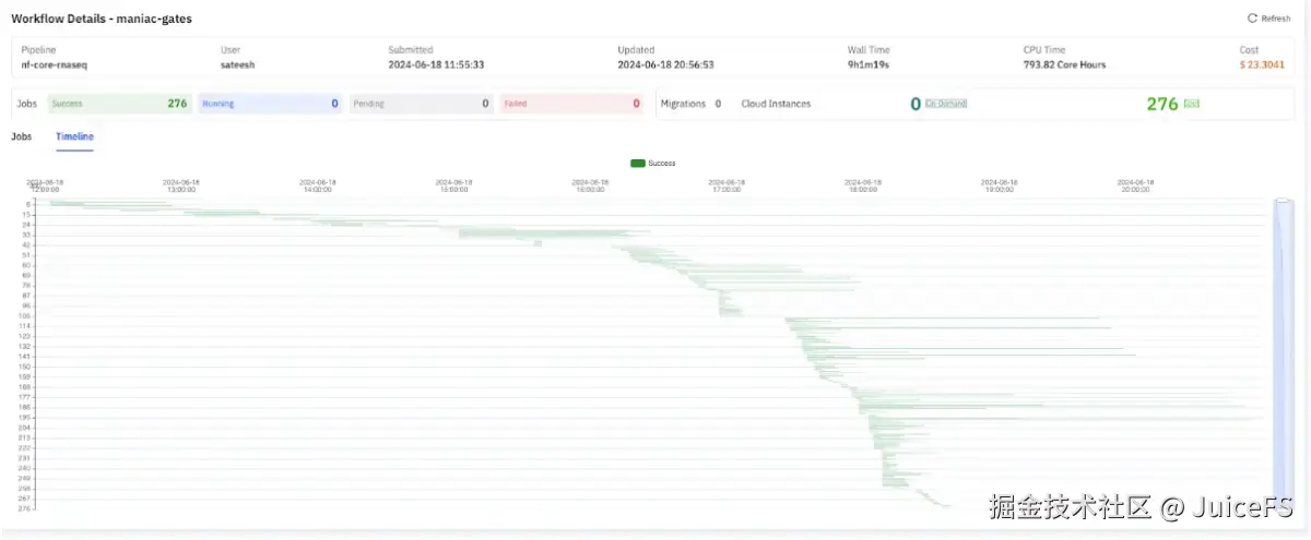 JuiceFS 在并发处理及相互依赖任务的管理方面表现良好,全程耗时 9 小时,成本仅为 23 美元。