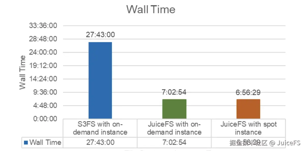 结果如我们预期的相同,JuiceFS 在 MMCloud 的 spot instance 上表现更优;我们也同样测试了 S3FS,耗时远高于 JuiceFS 在两种实例下的表现。
