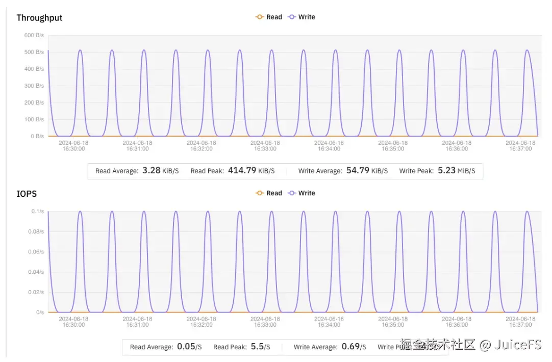 S3FS 在处理此类小文件时效率低下,平均每分钟仅能完成 0.5 个文件,导致大量任务用时过长,进而被 NextFlow 判定为失败任务;相比之下,JuiceFS 每分钟平均能完成 2.5 个小文件的写入,是 S3FS 的 5 倍。