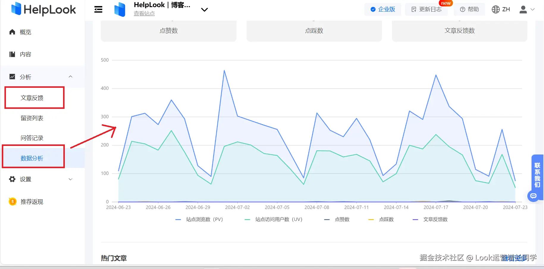 HelpLook AI知识库就同时具有数据分析和文章反馈功能,提供数据汇总和文章、搜索词、内容作者以及文章反馈的具体数据,以及可以查看用户阅览文章后提交的内容反馈。