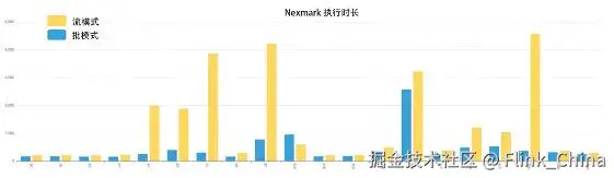 为了说明这一点,笔者选择了 Nexmark 基准测试来对比相同资源下 Flink 分别在流模式和批模式下的性能结果(由于资源限制原因未选择 TPC-DS),在绝大部分的 Query 上,批模式的执行时长相较于流模式能够降低约 17%~92%,这验证了批模式在吞吐上具有一定的优势,相关结果如下图所示: