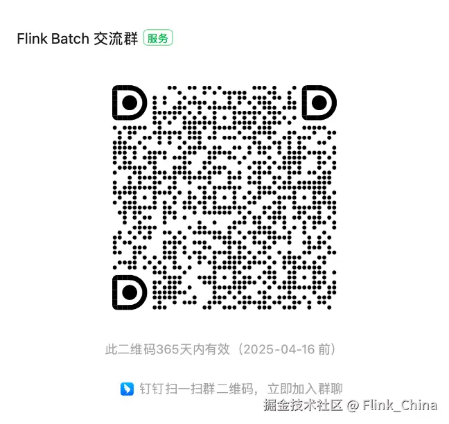 “Flink Batch 交流群”群的钉钉群号: 34817520,也可以扫码加入