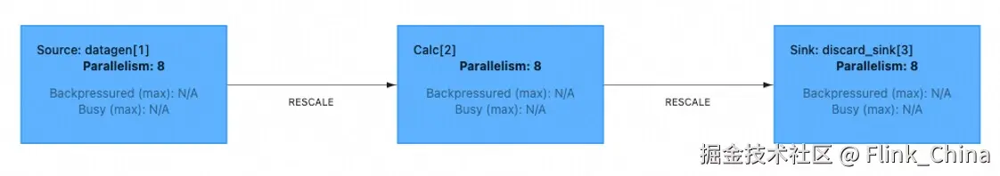 然而,其中 q10 批模式比流模式要更慢,这是由于批模式下对应的 Sink 节点额外引入了排序步骤,该步骤会消耗一定的 CPU 资源。同时,如果作业中仅包含无状态算子(如 Map、Filter),并且包含了较多 Shuffle 步骤,流模式可能会更加高效。以上述实验结果中的q0为例,作业中仅包含了 Source->Sink 的 ETL 逻辑,由于 Flink 进行了 OperatorChain 优化,此时作业中没有 Shuffle,执行时长上批模式比流模式执行时间缩短了约 18%。但在实际生产情况下,往往存在很多无状态作业,由于作业中的算子并行度不完全一致或者拓扑结构等原因导致无法全部 Chain 在一起。为了测试这种情况,笔者将 Flink 的 OperatorChain 功能关闭后再次对 q0 进行了对比,此时 q0 的执行过程会包含Shuffle,作业拓扑如下图所示: