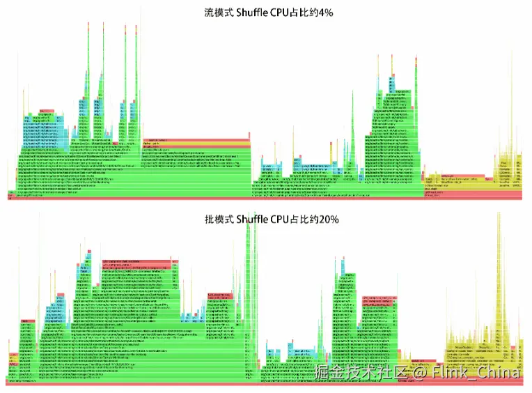 经过再次进行测试后发现,此时流模式的执行时间比批模式缩短了大约 35%。笔者通过火焰图对性能瓶颈进行定位,发现在作业执行过程中,批模式的 Shuffle 过程消耗了比流模式更多的 CPU 资源,如下图所示: