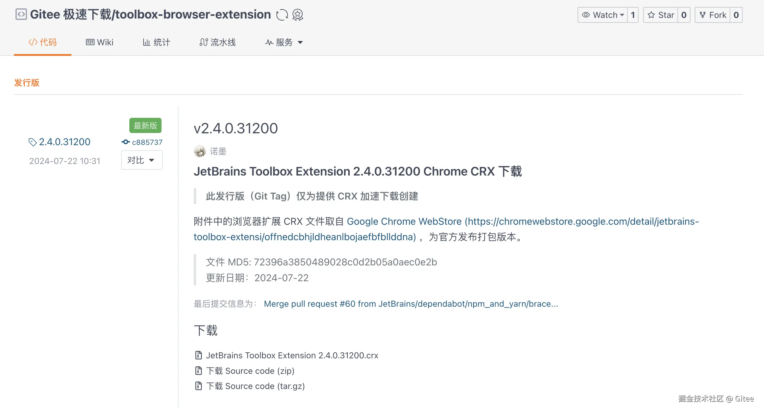 除了浏览器扩展商店外,你还可以直接在 Gitee 下载该扩展的 CRX 文件,直接进行拖拽安装。访问 gitee.com/mirrors/too…,或在 Gitee 搜索toolbox-browser-extension进入发行版页面即可。
