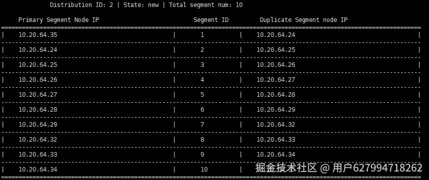 配置成功后可以通过gcadmin showdistribution查看数据分布方式,示例如下: