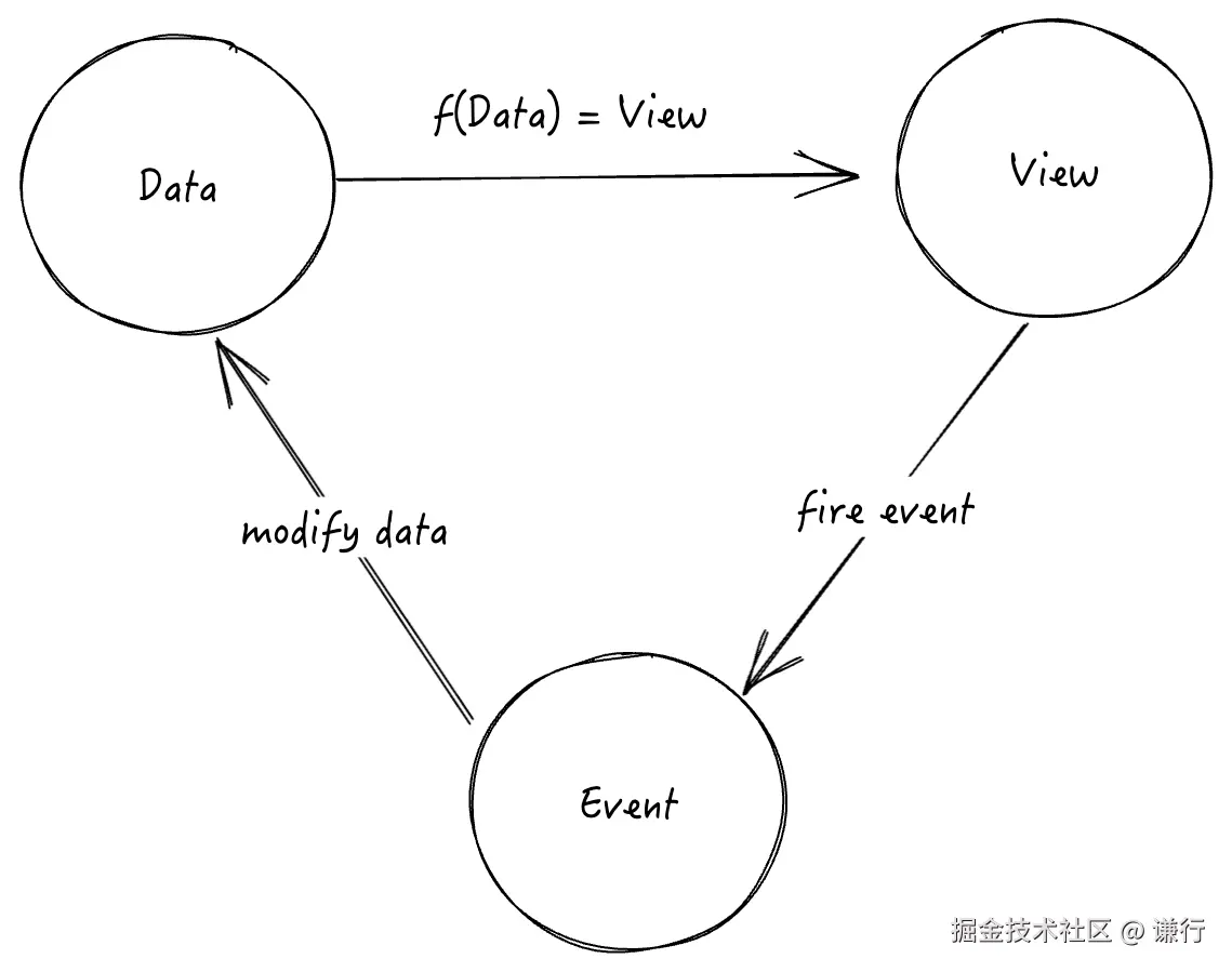 而大部分 Web UI 除了静态展示,还需要响应用户的交互对 UI 做出变化,在表单输入 input 内容应该更新、点击轮播图片的 “下一个” 图标,显示的图片应该切换、点击“下单”商品应该被加入到购物车等。业界有各种流派解决这个问题