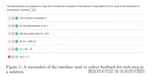 尽管有这些优势,Uesato等人(2022)发现,结果监督和过程监督在小学数学领域有类似的最终表现。论文对结果和过程监督进行了详细的比较,但有三个主要区别:论文使用更强大的基础模型,论文使用更多的人工反馈,论文对更具挑战性的MATH数据集进行训练和测试(Hendrycks et al.,2021)。