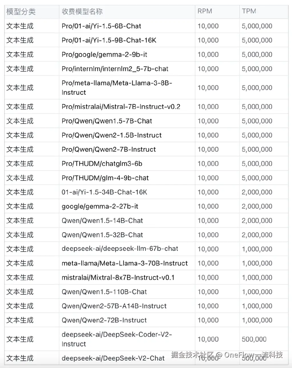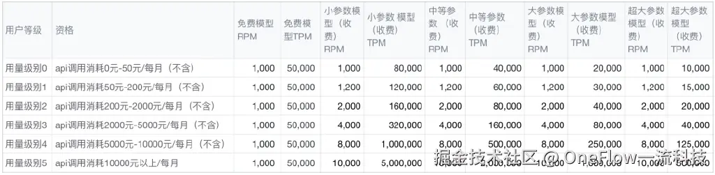收费版模型按照用量付费,最高速率随着用量级别提升而增大。同一用量级别下,不同参数大小的模型最高速率不同。新方案将收费模型的RPM从100可提升至最高10000,TPM可提升至最高500万。