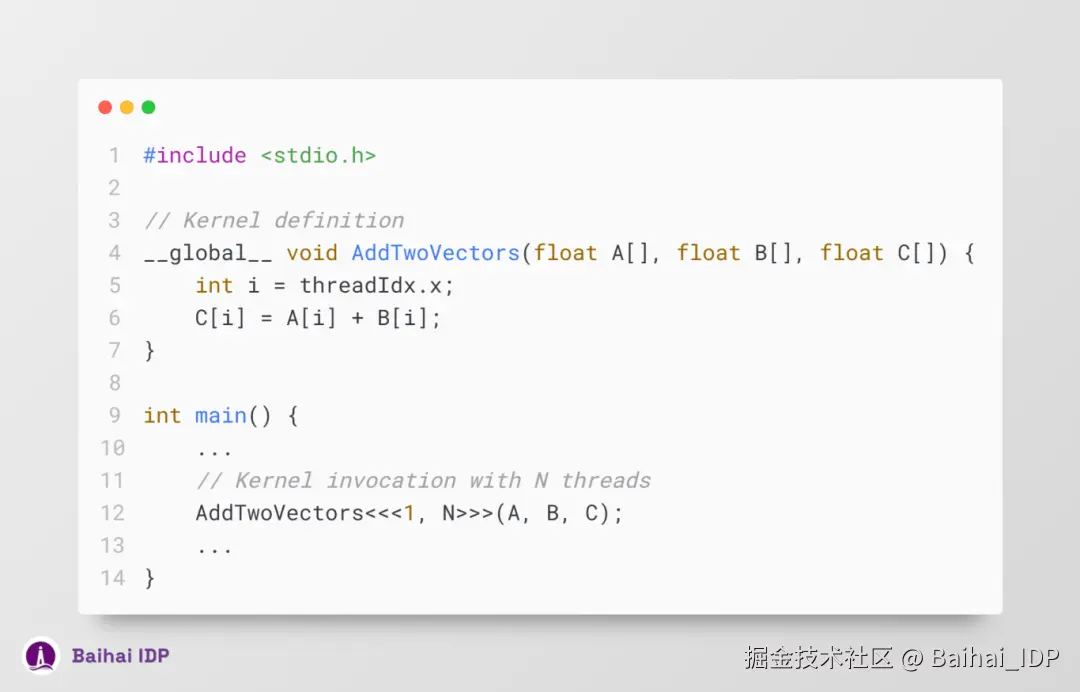 每个 CUDA 线程在执行 kernel 时,都会被赋予一个独一无二的线程 ID,即 threadIdx,它可以通过 kernel 中的预设变量获取。上述示例代码将两个长度(size)均为 N 的向量 A 和 B 相加,并将结果保存到向量 C 中。值得我们注意的是,相较于循环逐次处理成对加法的传统串行方式,CUDA 的优势在于其能够并行利用 N 个线程,一次性完成全部加法运算。