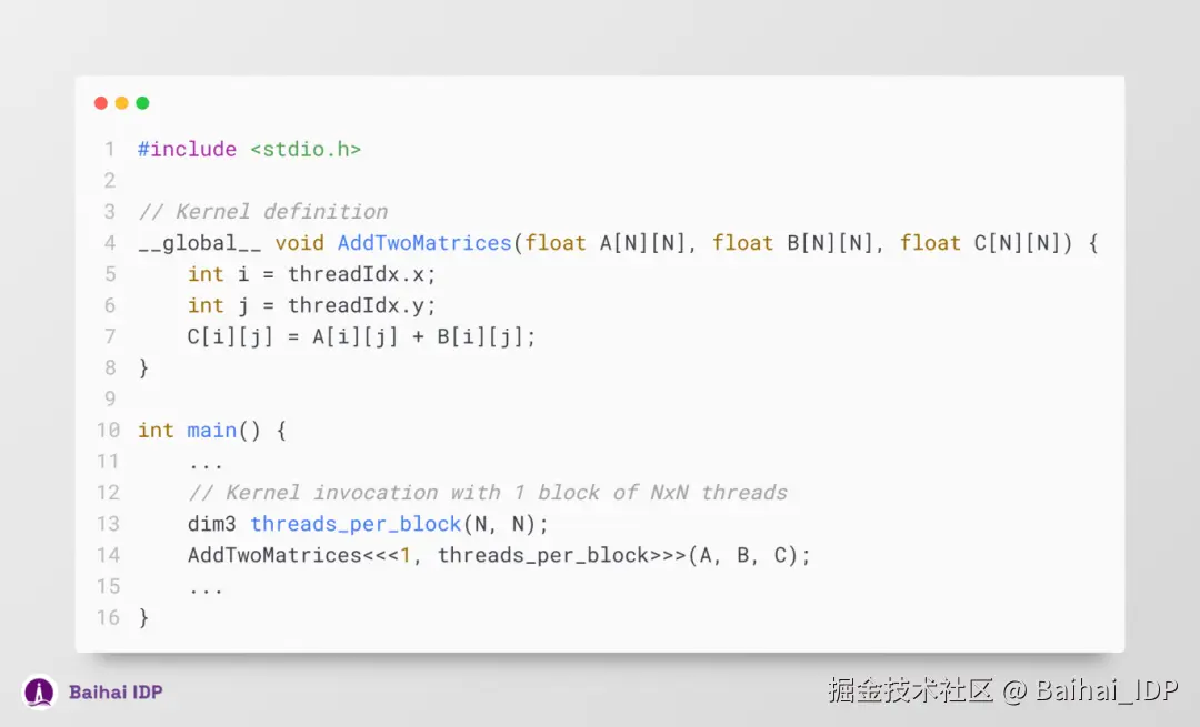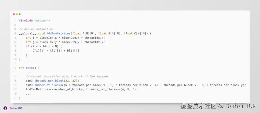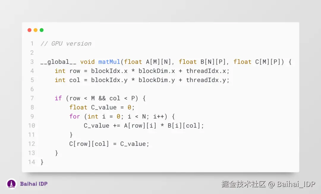 至此,我们已经掌握了 CUDA 编程的核心概念,现在可以着手构建 CUDA kernels 了。对于深度学习模型而言,其实质就是一系列涉及矩阵(matrix)与张量(tensor)的运算操作,包括但不限于求和(sum)、乘法(multiplication)、卷积(convolution)以及归一化(normalization )等。举个例子,一个基础的矩阵乘法算法,可以通过以下方式实现并行化: