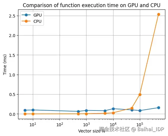 下表展示了在处理不同大小向量的加法运算时,CPU 与 GPU 的计算性能对比情况。
