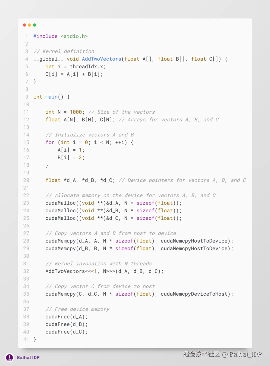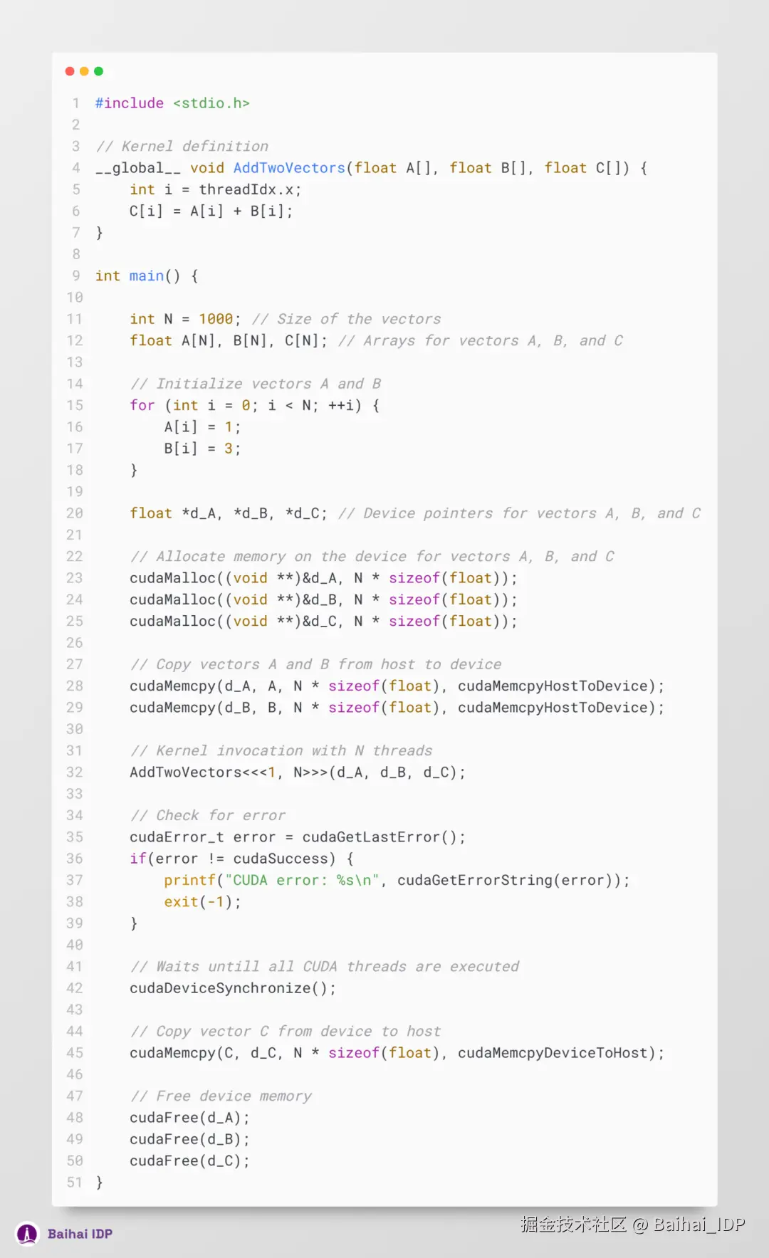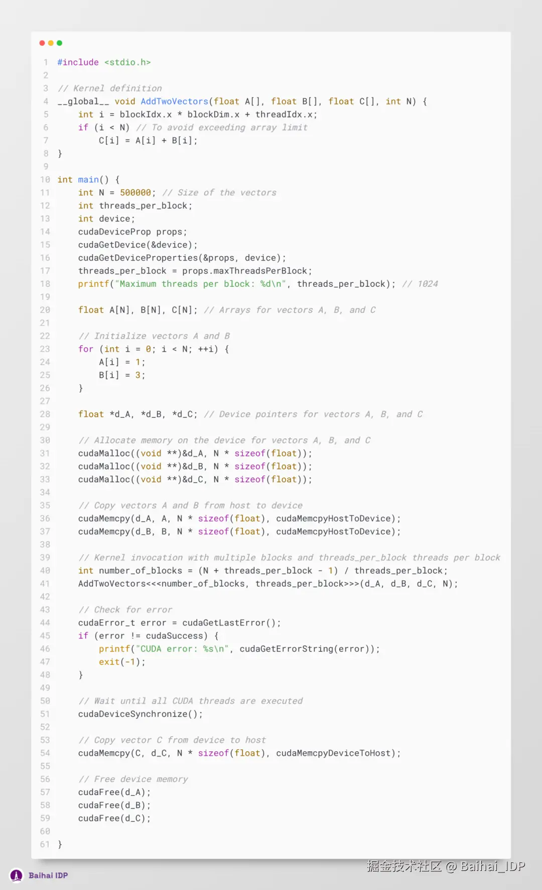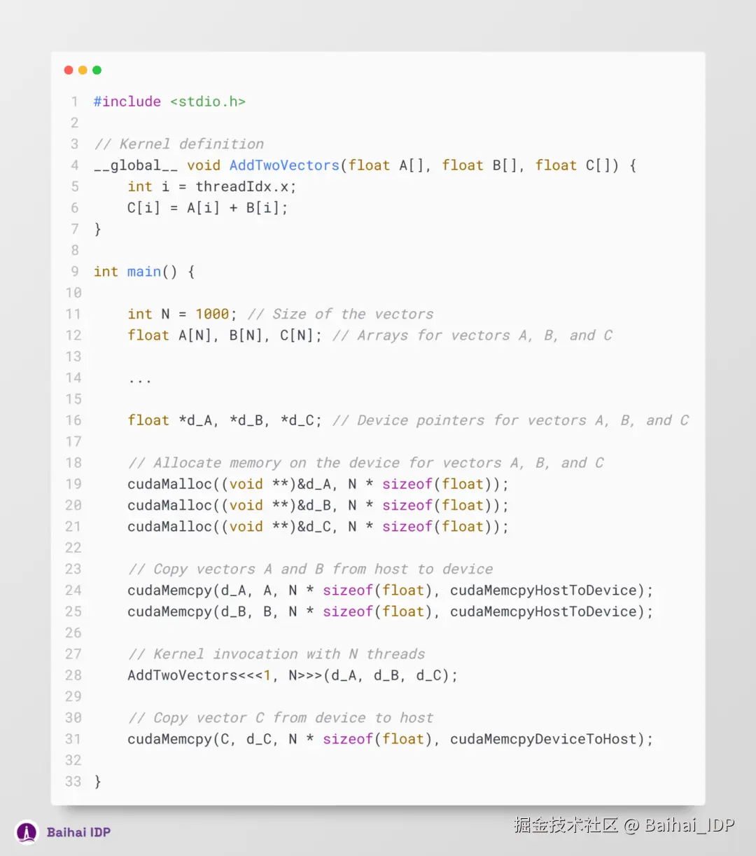 至此,我们可在代码中实现向量 A 和 B 的初始化,并在程序结尾处清理 CUDA 内存(cuda memory)。