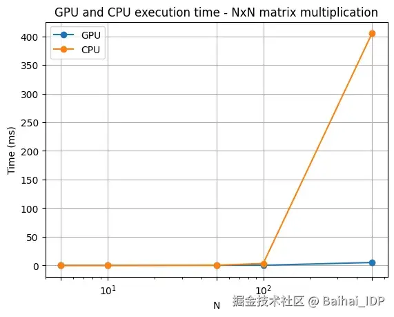 我们可以注意到,在 GPU 版本的矩阵乘法算法中,循环次数明显减少,从而显著提升了运算处理速度。下面这张图表直观地展现了 N x N 矩阵乘法在 CPU 与 GPU 上的性能对比情况: