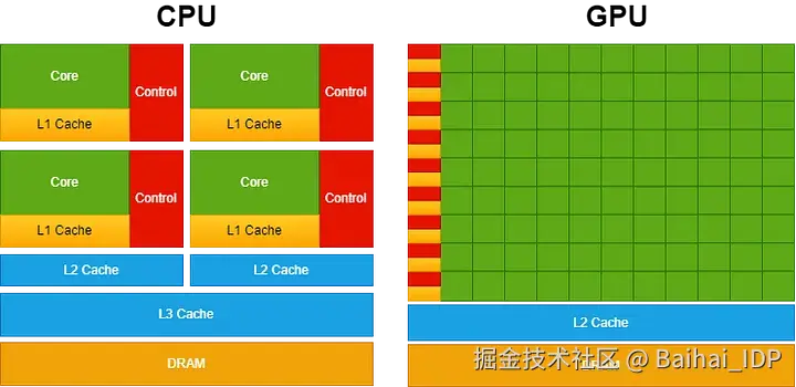 下图生动地描绘了 CPU 与 GPU 在芯片资源分配上的显著差异。