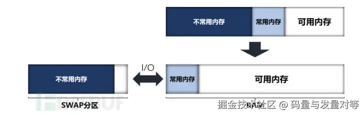SWAP即内存交换技术或虚拟内存技术,如图1所示,在系统的物理内存不足时,把内存中的一部分不常用的内存空间释放出来,以增大系统可用内存供当前运行的程序使用。这些被释放的数据被临时保存到SWAP分区中,等到需要使用时,再从SWAP分区中恢复到内存中。