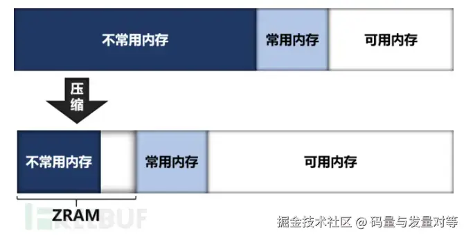 ZRAM即内存压缩技术,如图2所示,在系统的物理内存不足时,将系统物理内存的一部分划分出来作为ZRAM分区,然后把不常用的匿名页压缩后放到ZRAM分区里,相当于牺牲了一些CPU效率,以增大系统可用内存供当前运行的程序使用。等到需要使用时,再从ZRAM分区中将数据解压出来。