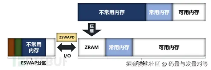 ESWAP结合内存压缩和内存交换技术,提供了自定义新增存储分区作为内存交换分区的能力,并在内核中创建了一个常驻进程ZSWAPD,用于将ZRAM压缩后的匿名页加密换出到ESWAP存储分区中,从而能完全地空出一块可用内存,以此来达到维持Memavailable水线的目标,如图4所示。
