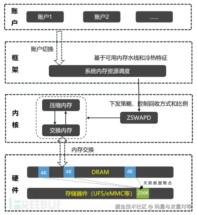 针对原有内存方案的不足,OpenHarmony构建了一套完善的内存解决方案ESWAP,打通了上层系统到内核的调用栈,让内核能在上层配置的指导下,对每一块内存数据进行合理的管理。