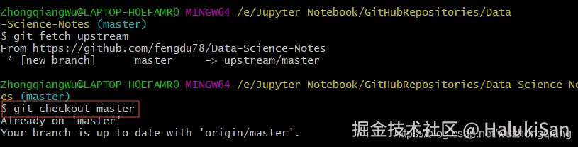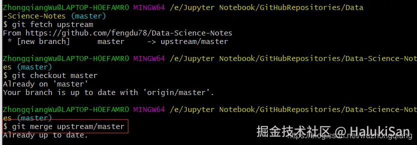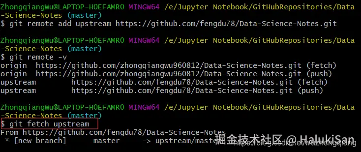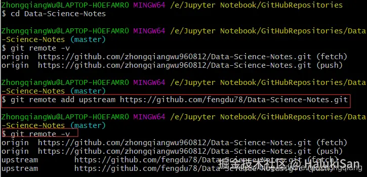 给 fork 配置一个 remote主要使用 git remote -v查看远程状态。克隆了fork项目到本地之后,进入那个项目文件夹,我就进入Data-Science-Notes的文件夹,然后输入命令