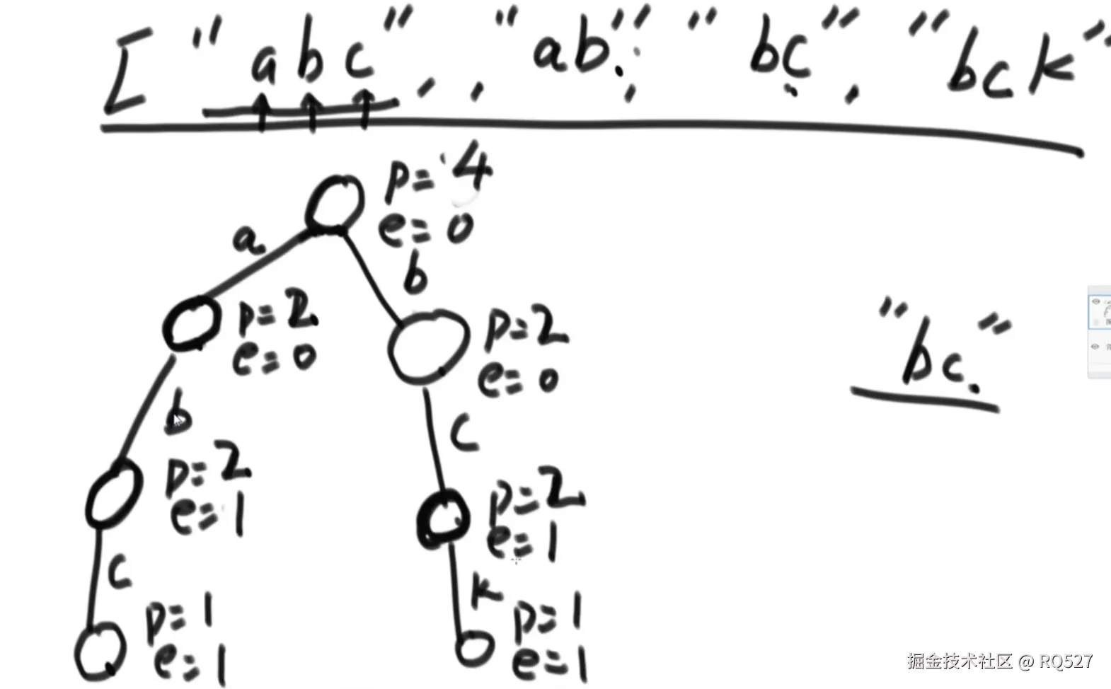 e等于零表示不存在这样的字符串。例如若想知道有多少字符串以ab为前缀,可以看ab结点上的p值