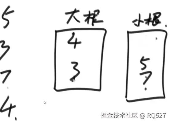 5先进入大根堆,3小于5进大根堆,此时大根堆的长度超过小根堆的长度超过2,将5弹出并放进小根堆