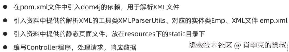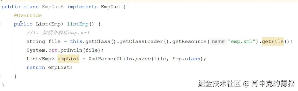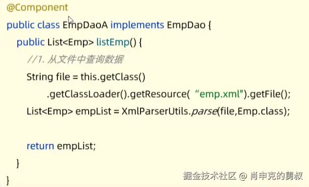 这里类去实现EmpDao接口,并实现其中的方法,把前面的原始Controller中属于dao层的代码(数据访问)放进这个方法中,结果返回集合empList