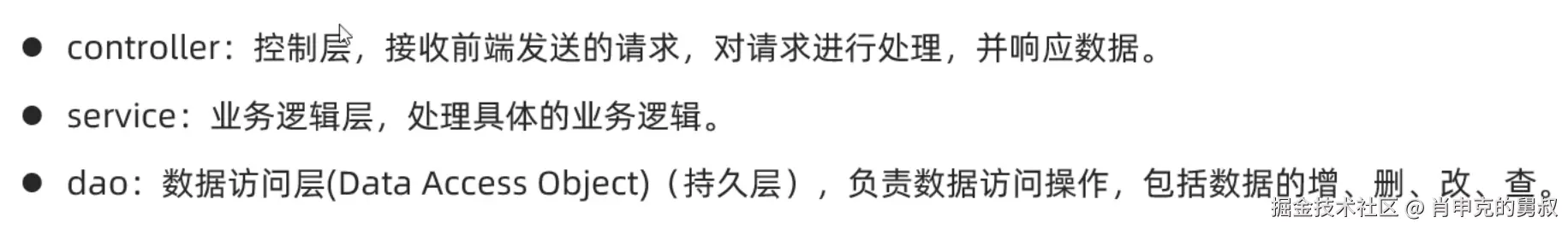 前面的全是把代码放在Controller的这个方法中 ,如果开发的是一个比较复杂的工程,那么Controller方法中有太多的数据操作、逻辑处理,代码的复用性和扩展性太差了,而且难以维护,所以我们会用到 —— 分层解耦,但我们先要了解什么是三层架构~!!