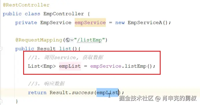在我们前端发起请求之后,先到达Controller程序,它只负责接受请求、响应数据,当他接收到请求之后,就直接去调用Service层中的方法listEmp()①
